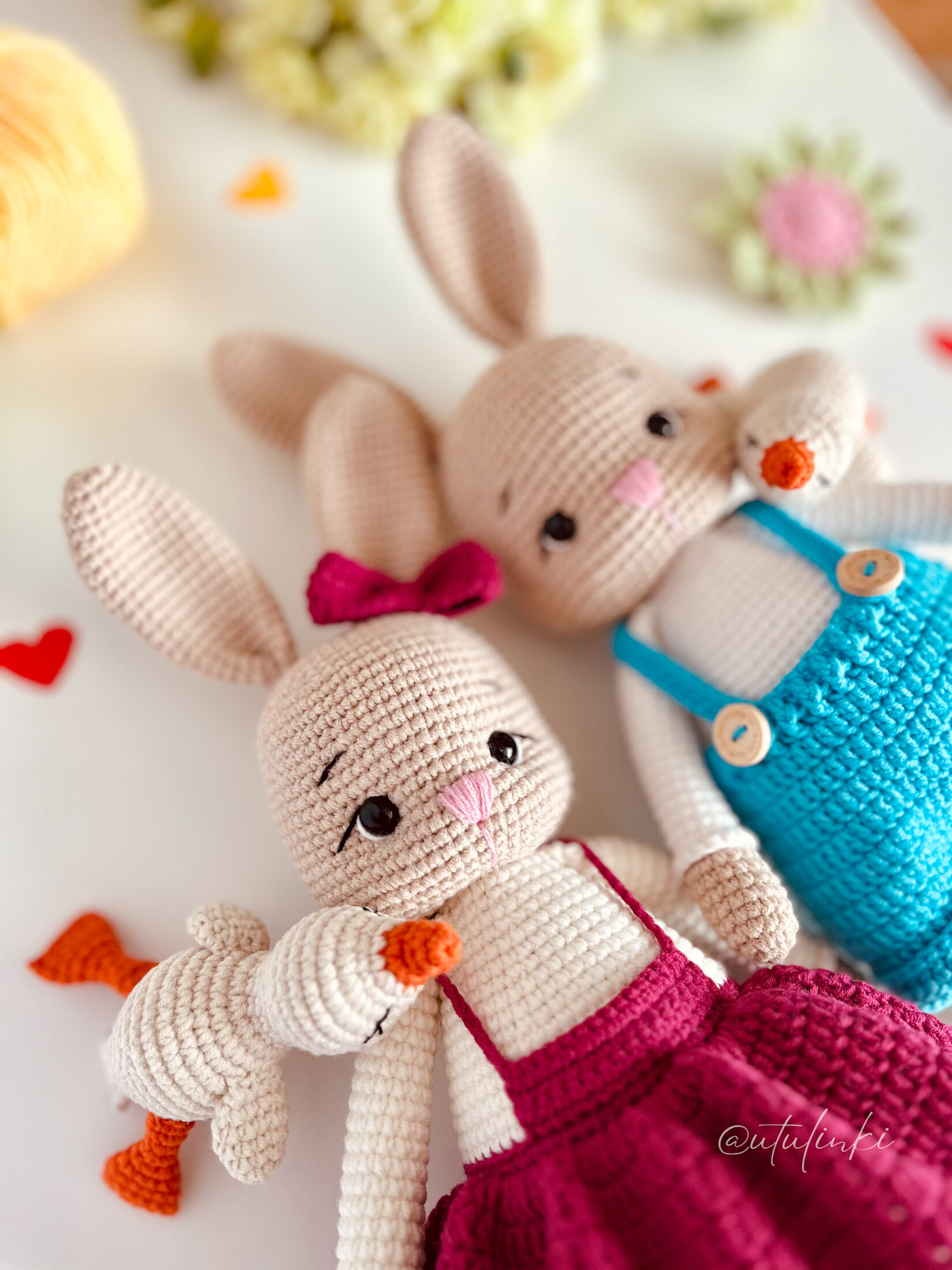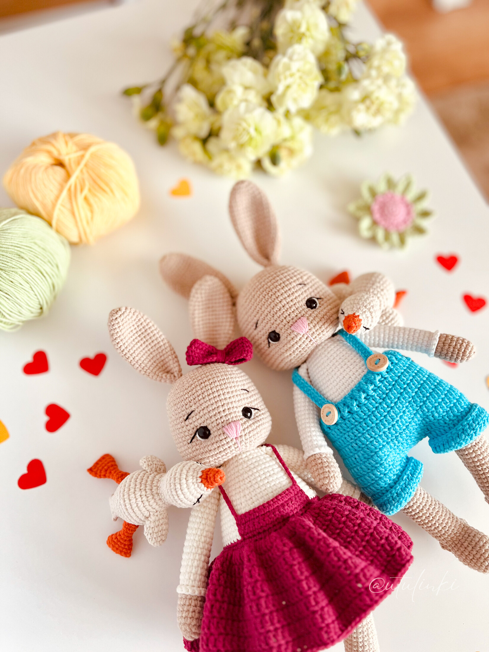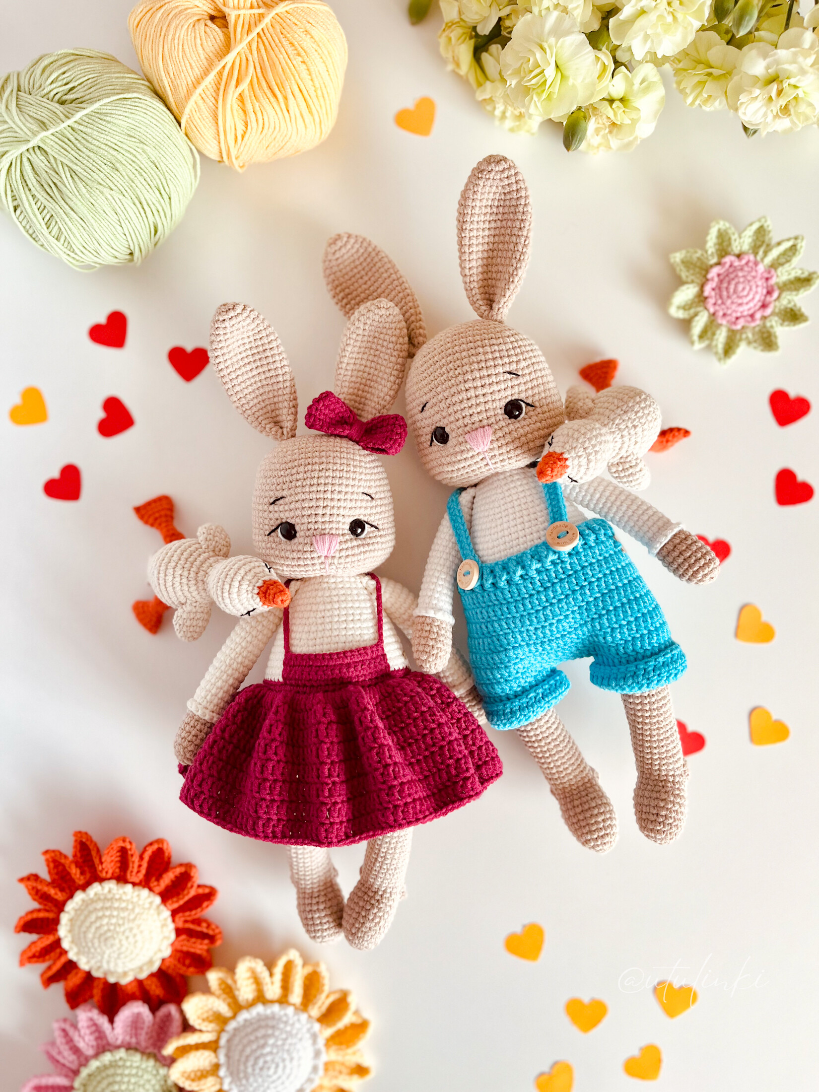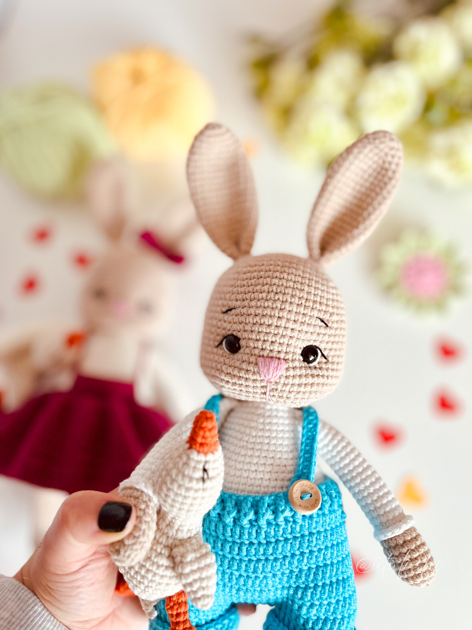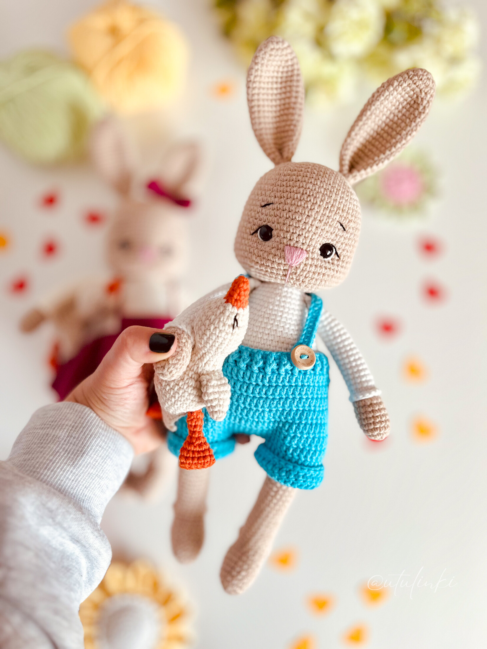 Poznaj uroczego króliczka, który skradnie serca małych i dużych! Ręcznie wykonany na szydełku z dbałością o każdy szczegół, ubrany w stylowe niebieskie ogrodniczki. Zawsze ma przy sobie swoją wierną towarzyszkę - gąskę. To nie tylko zabawka - to wyjątkowy dodatek, który wniesie do domu odrobinę ciepła, humoru i przytulności.