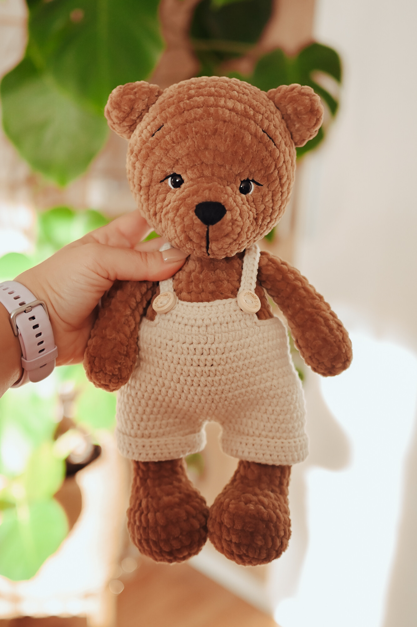 Poznaj uroczego misia, który skradnie serca małych i dużych! Ręcznie wykonany na szydełku z dbałością o każdy szczegół, ubrany w stylowe ogrodniczki. To nie tylko zabawka - to wyjątkowy dodatek, który wniesie do domu odrobinę ciepła, humoru i przytulności.