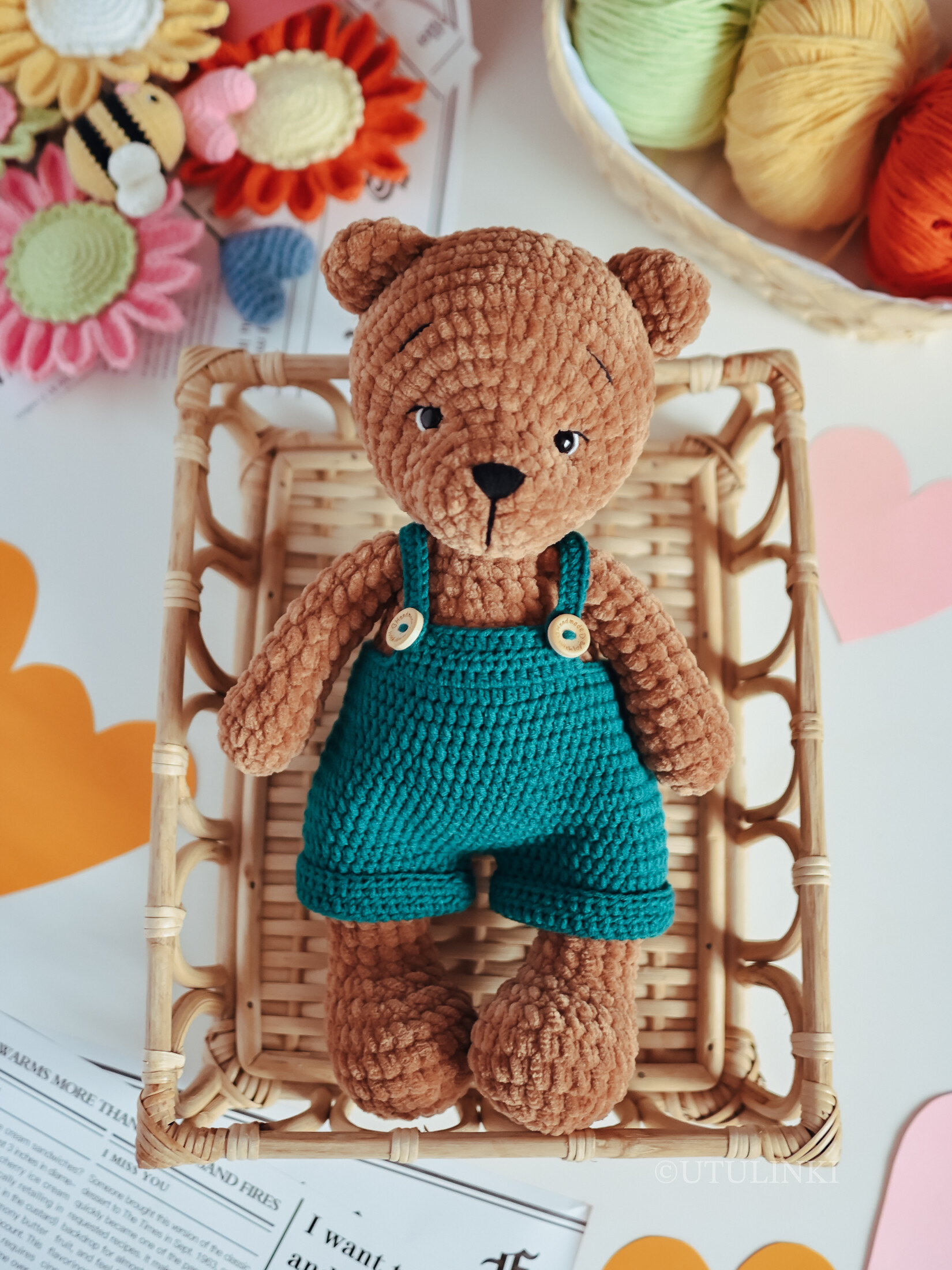Poznaj uroczego misia, który skradnie serca małych i dużych! Ręcznie wykonany na szydełku z dbałością o każdy szczegół, ubrany w stylowe ogrodniczki. To nie tylko zabawka - to wyjątkowy dodatek, który wniesie do domu odrobinę ciepła, humoru i przytulności.